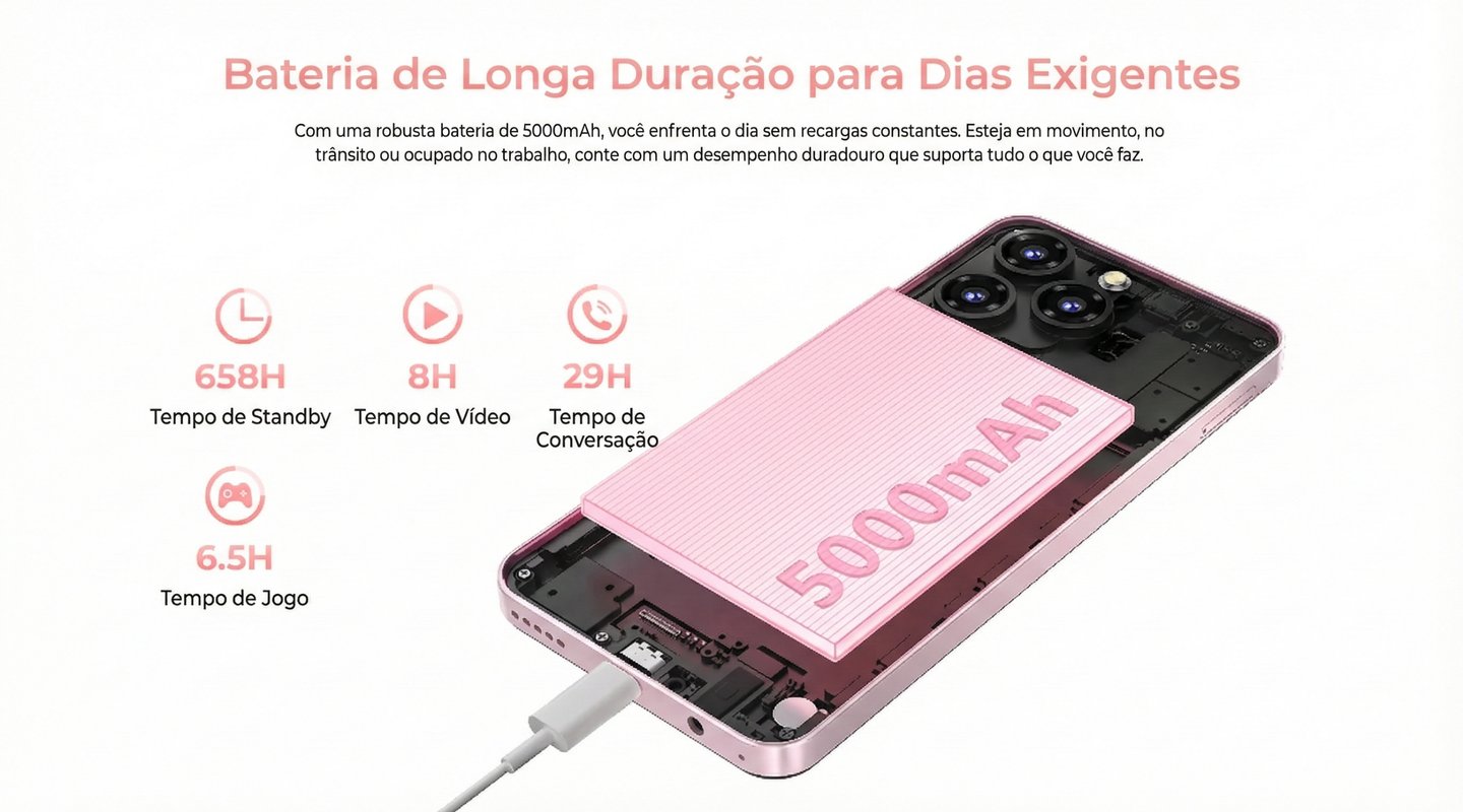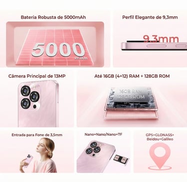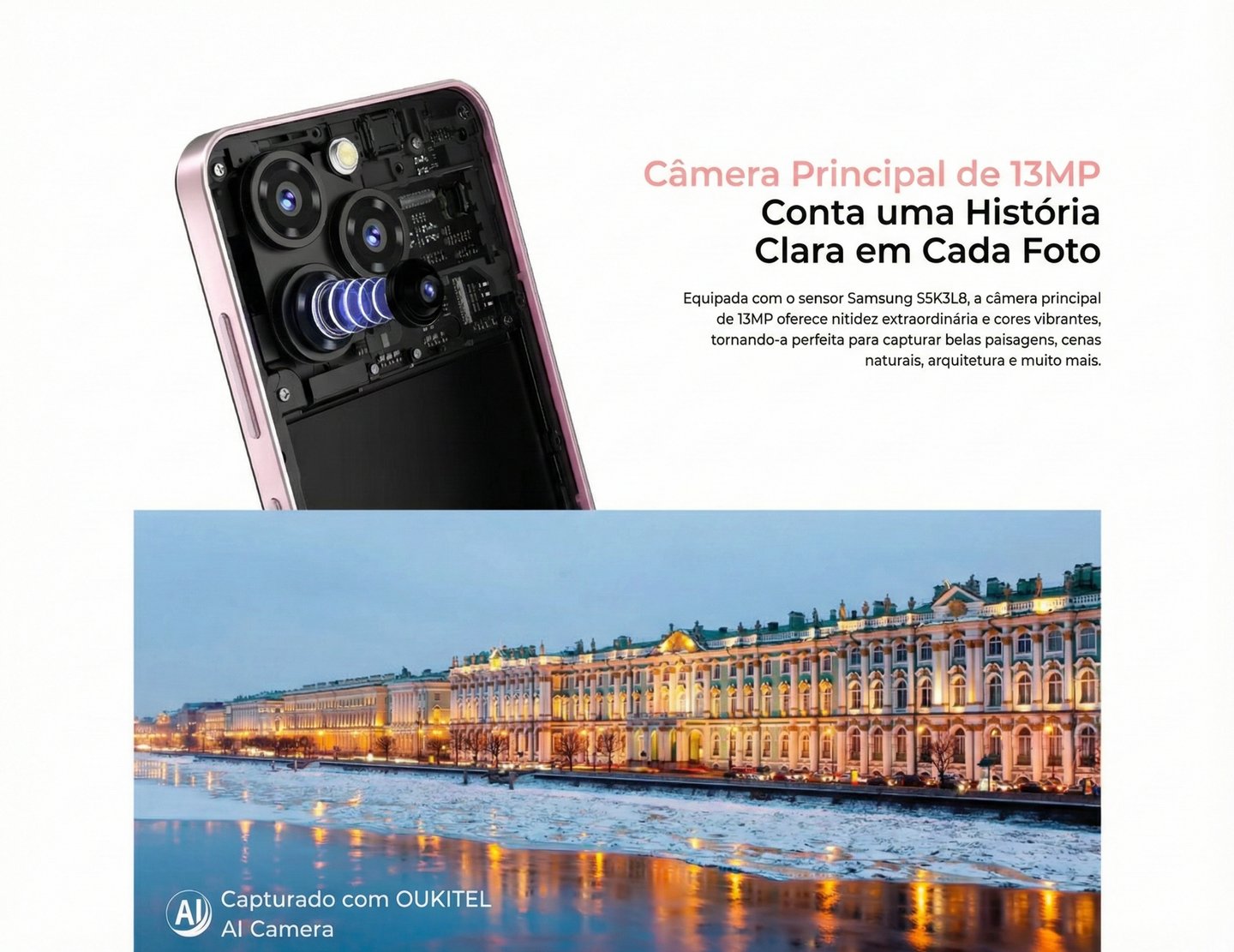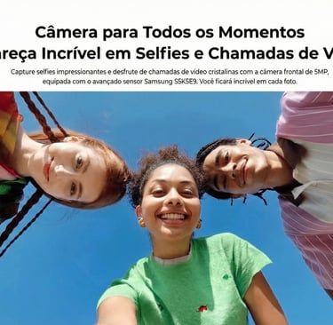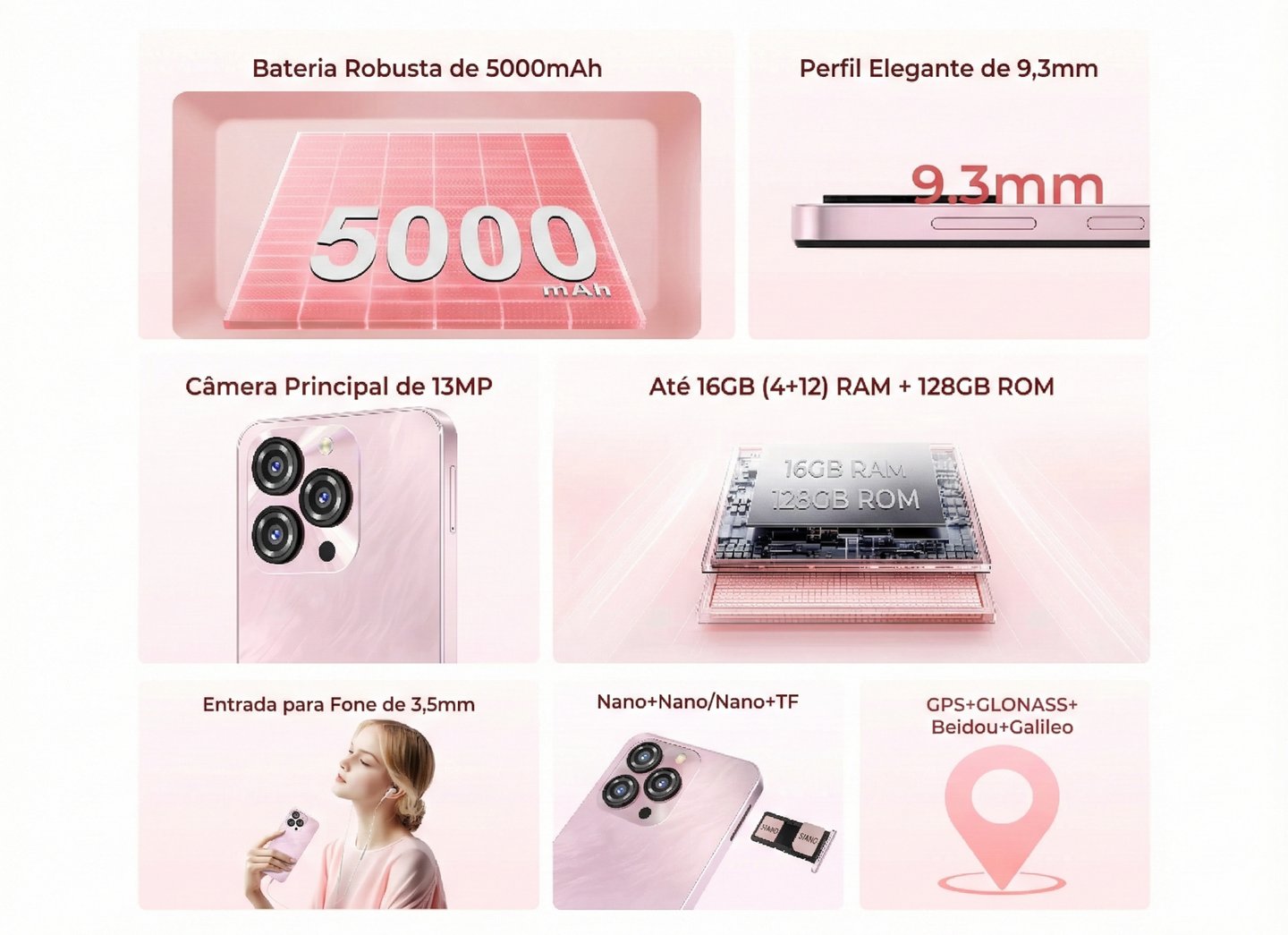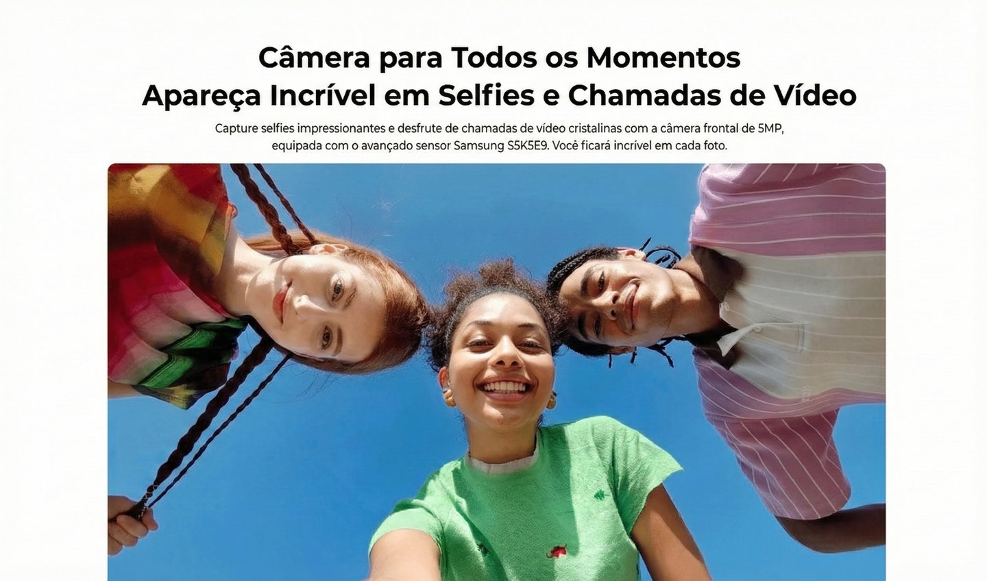 ✔ Câmera traseira de 13 MP + câmera frontal de 5 MP