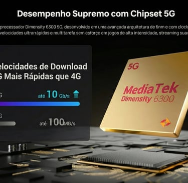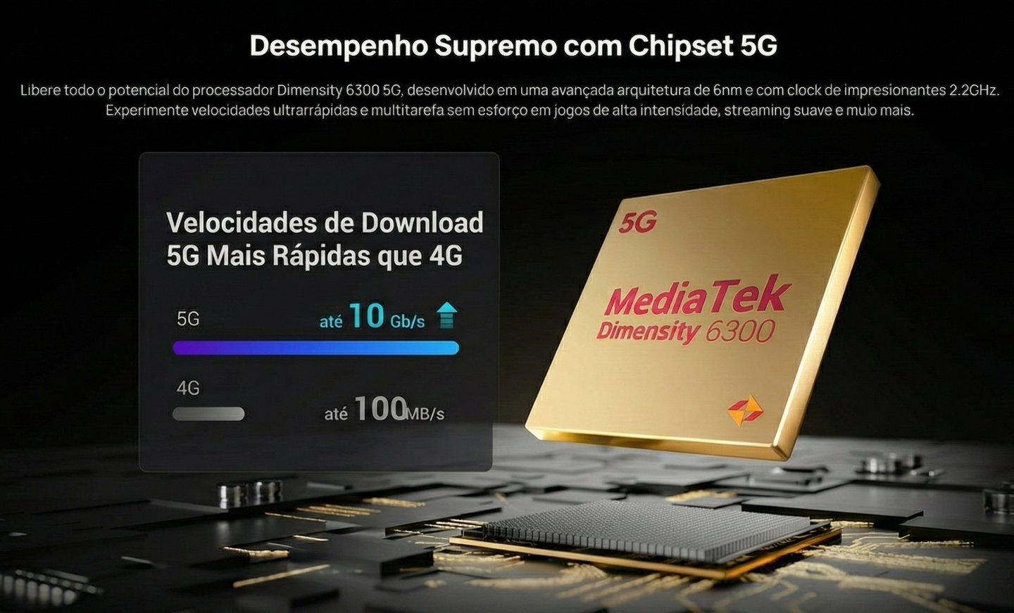 ✔ Processador MediaTek Dimensity 6300 octa-core de 6 nm com 5G