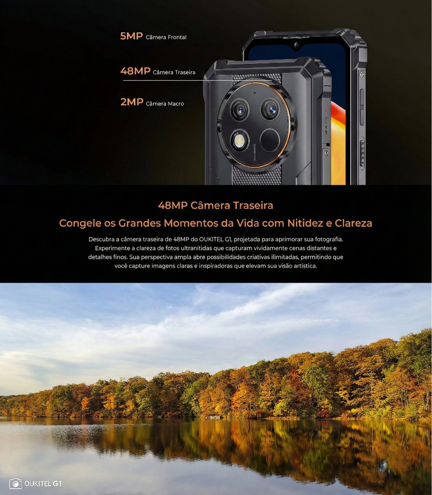 ✔ Câmera traseira de 48 MP + câmera frontal de 5 MP